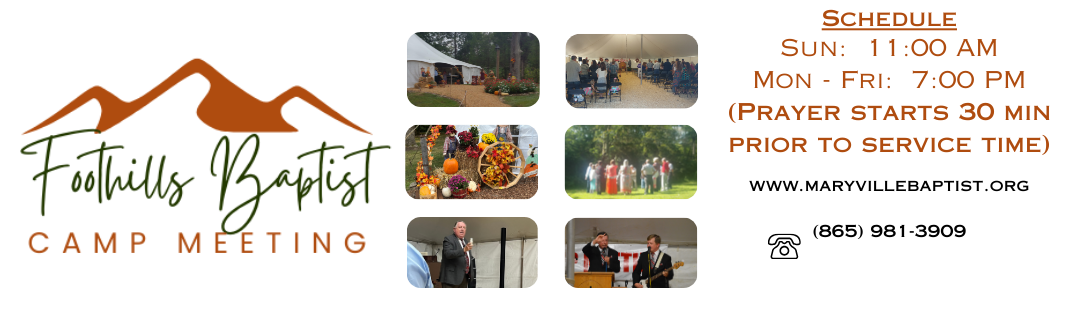 Sunday (9/14) – 11:00 AM: Maryville Baptist Tabernacle morning church service will be held under the tent to kick off camp meeting week. All are welcome!